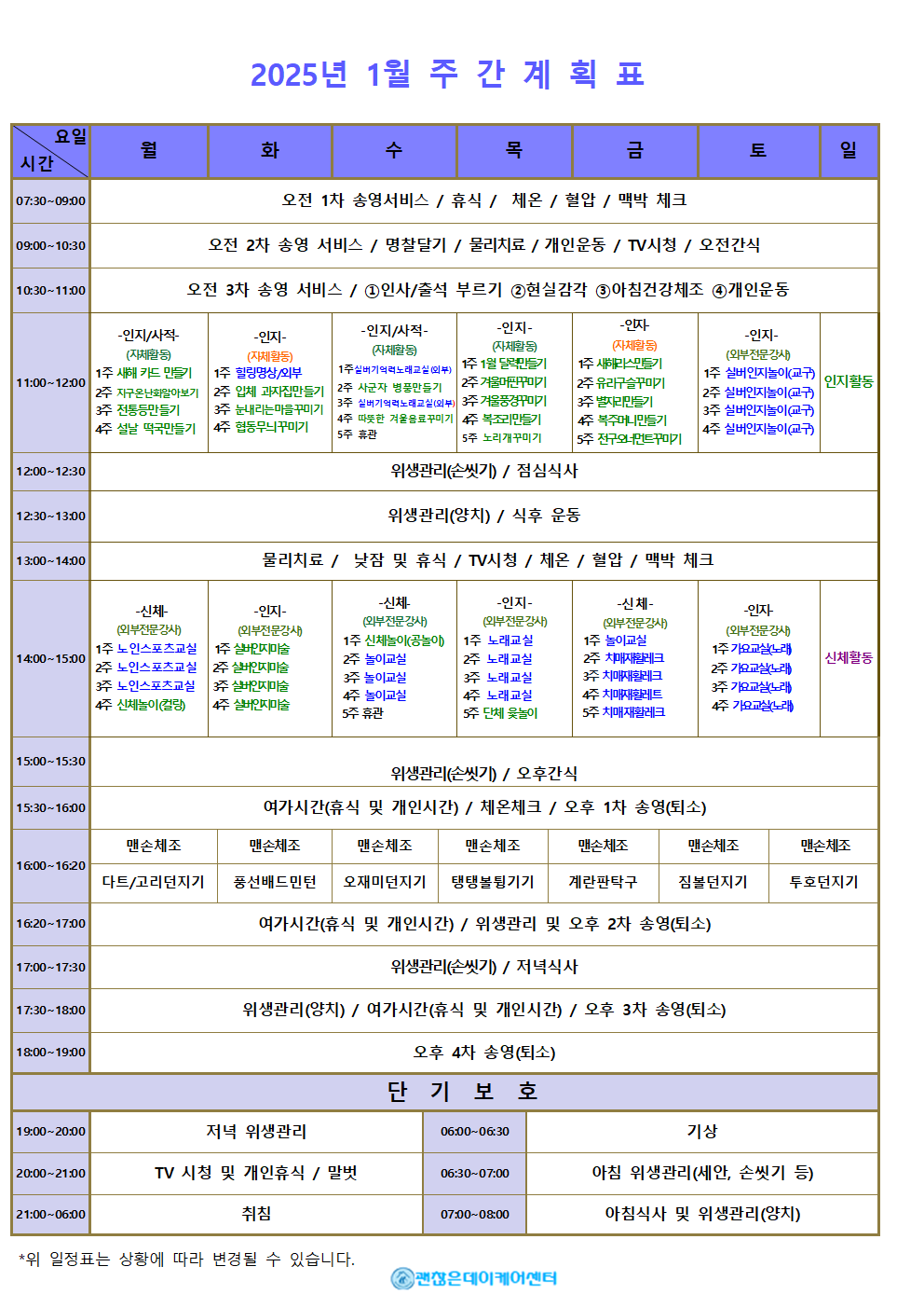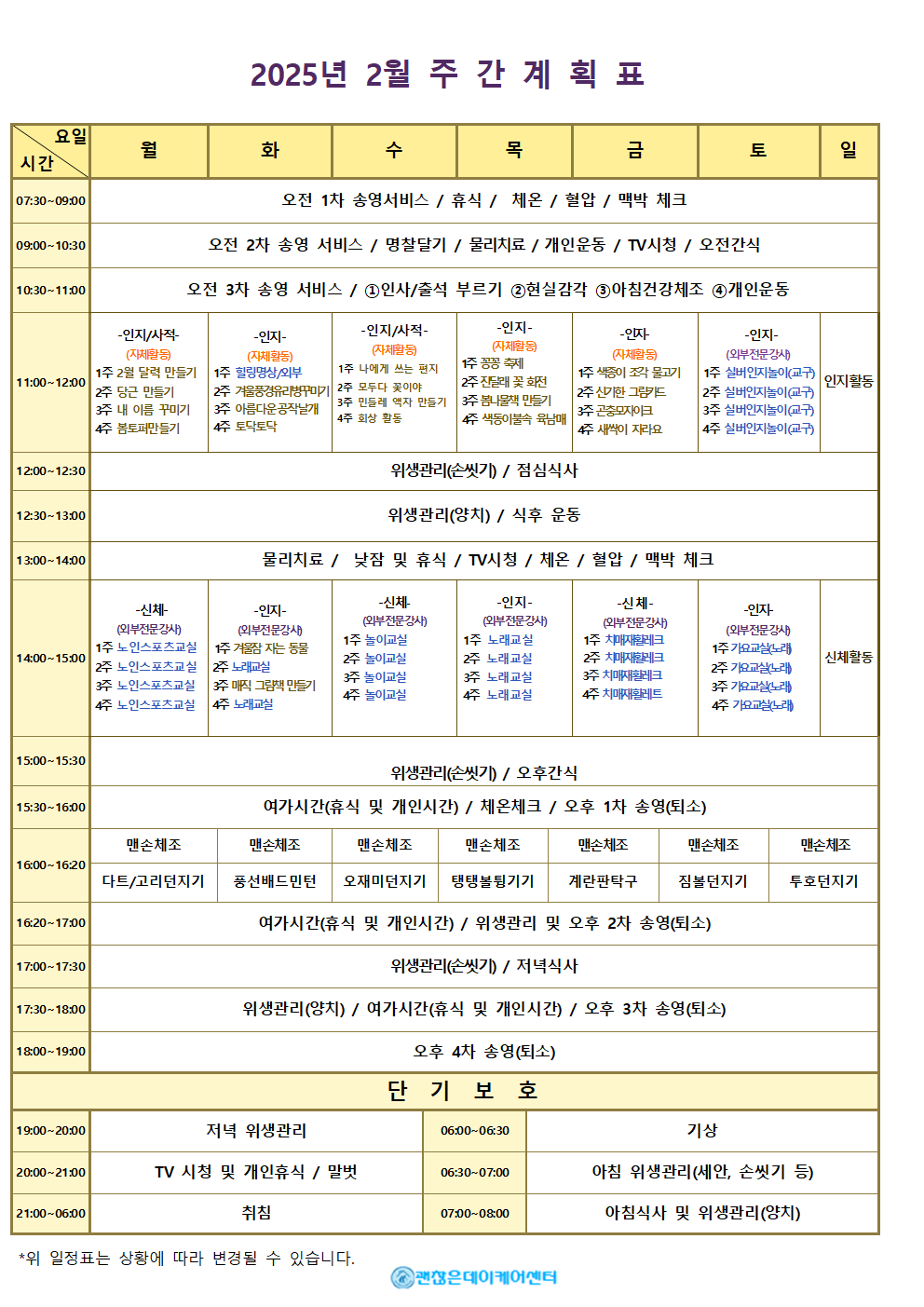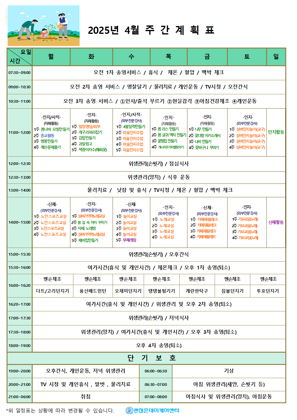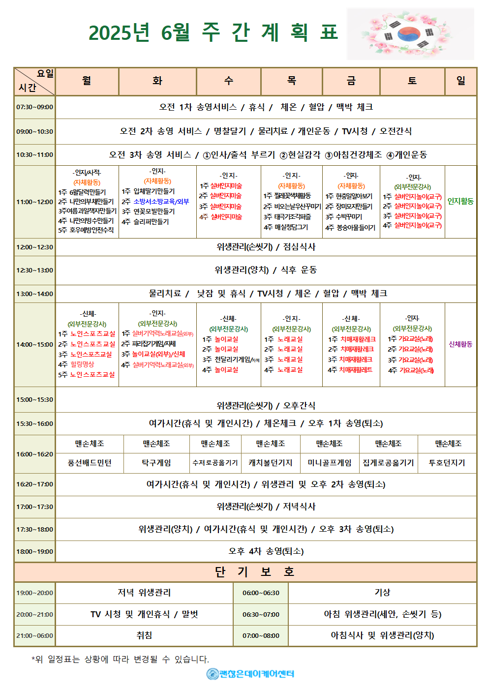 주간계획표 데이케어센터는 어르신들의 하루가 의미 있고 건강하게 채워질 수 있도록 주간 계획표를 운영합니다. 요일별 활동 프로그램과 식단을 확인하실 수 있으며, 인지·운동 활동부터 문화·여가 프로그램까지 다양하게 준비되어 있습니다. 모든 식사는 영양사가 관리하며, 건강 상태에 맞춰 조정이 가능합니다. 매주 업데이트되는 주간 계획표를 통해 사랑하는 가족의 하루를 안심하고 지켜보세요.
