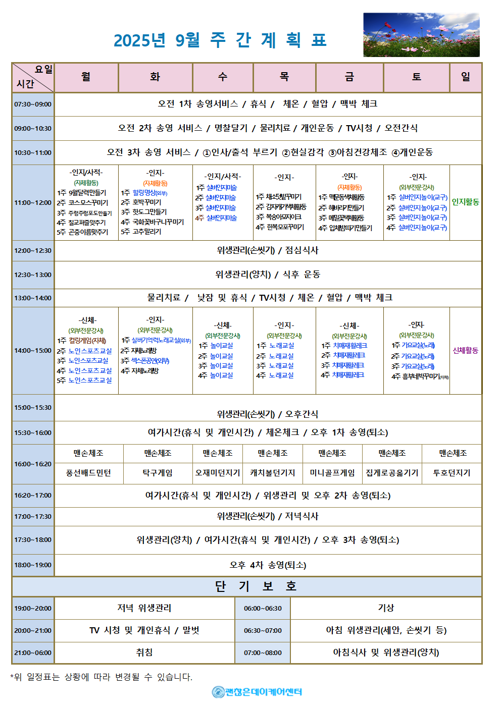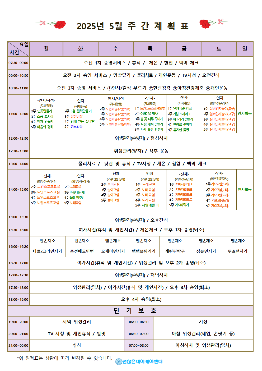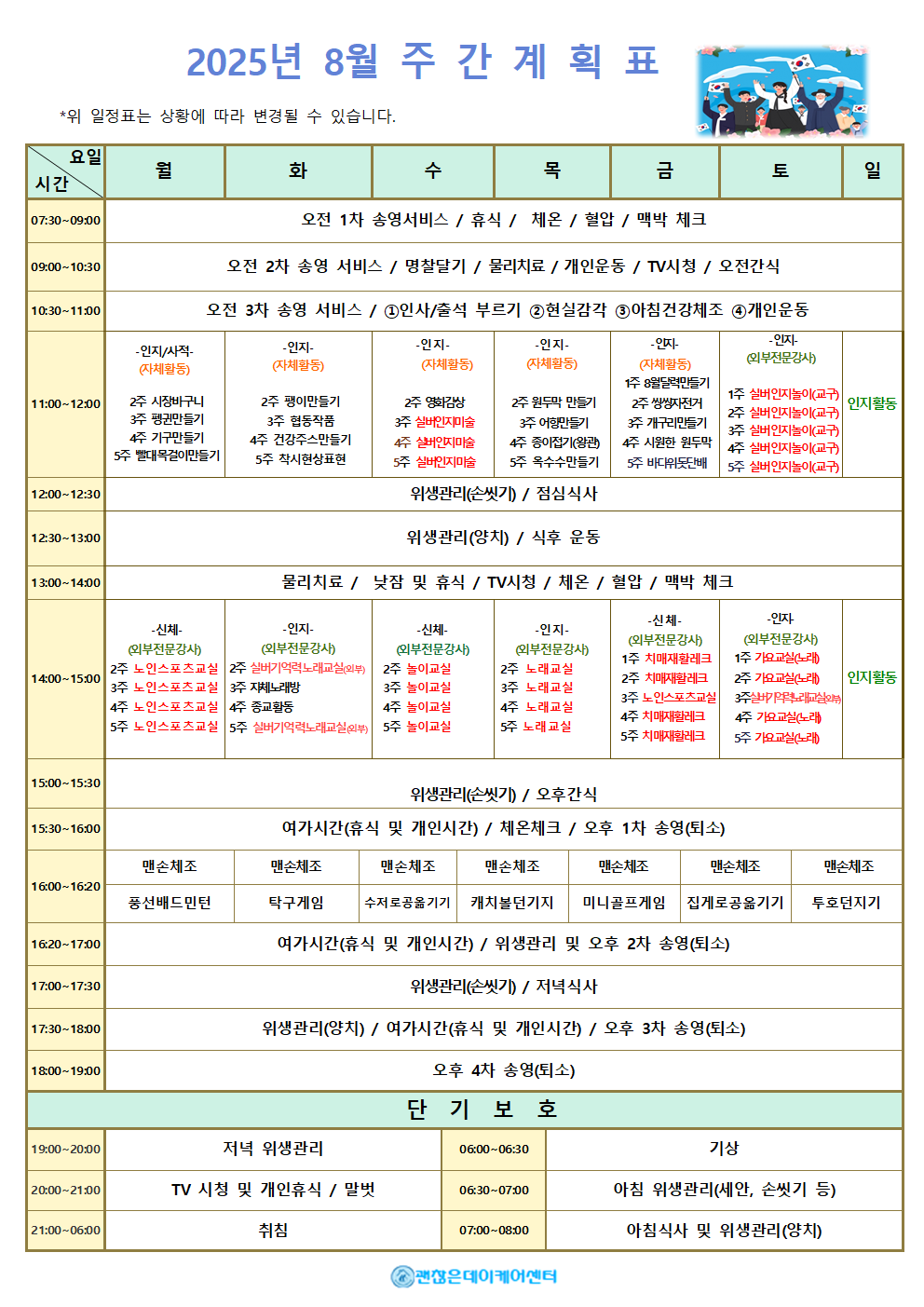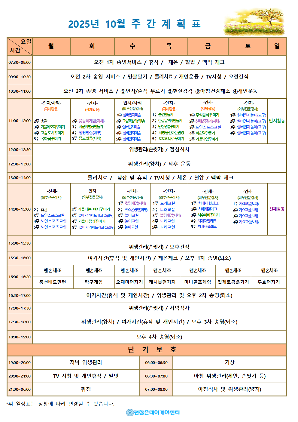 주간계획표 데이케어센터는 어르신들의 하루가 의미 있고 건강하게 채워질 수 있도록 주간 계획표를 운영합니다. 요일별 활동 프로그램과 식단을 확인하실 수 있으며, 인지·운동 활동부터 문화·여가 프로그램까지 다양하게 준비되어 있습니다. 모든 식사는 영양사가 관리하며, 건강 상태에 맞춰 조정이 가능합니다. 매주 업데이트되는 주간 계획표를 통해 사랑하는 가족의 하루를 안심하고 지켜보세요.
